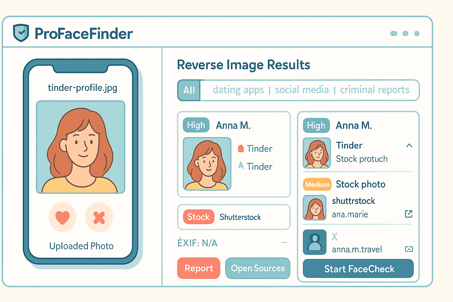 Tras la carga, la herramienta escanea la estructura facial -como las proporciones, el espaciado de los ojos y el contorno facial- y la compara con los resultados indexados. A diferencia de las herramientas estándar de búsqueda inversa de imágenes, que buscan imágenes idénticas, ProFaceFinder se centra en la coincidencia de rostros incluso cuando las imágenes proceden de escenas o ángulos diferentes.