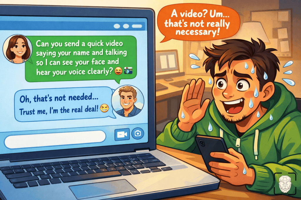 Esta pergunta é a melhor solução para os "catfishes" que estão a usar as fotografias de outras pessoas. É simples e eficaz porque os vídeos em tempo real são difíceis de falsificar.